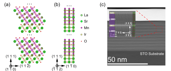 研究利用自主搭建的脈沖激光沉積系統,生長出具有銳利原子級界面質量的銥酸鍶/錳酸鑭鍶超晶格,并通過多種先進表征手段,證實界面結構的高質量與低原子擴散特性。磁輸運測量顯示,該體系在接近300K的溫區內表現出穩定的鐵磁絕緣行為;X射線磁性圓二色測試證實,室溫鐵磁性起源于錳酸鑭鍶的雙交換相互作用。