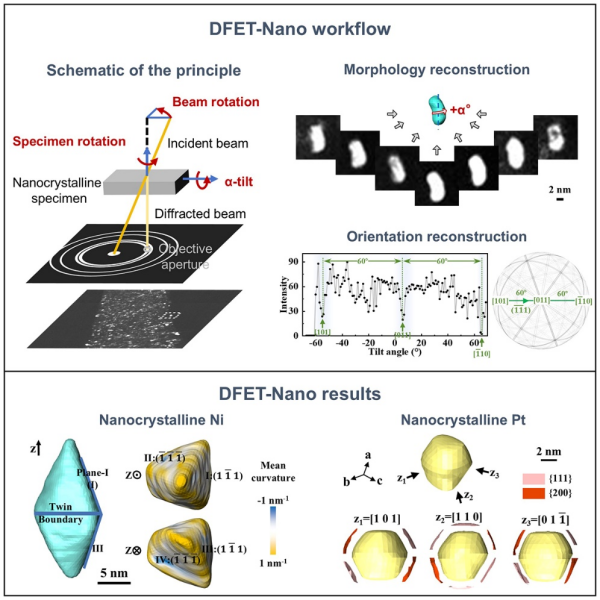 近日,中國科學院金屬研究所團隊,發展了一種暗場電子層析成像方法(DFET-Nano),實現了納米晶粒三維形貌與晶體學取向的同步重構,并能夠定量解析晶界面取向及其曲率特征。