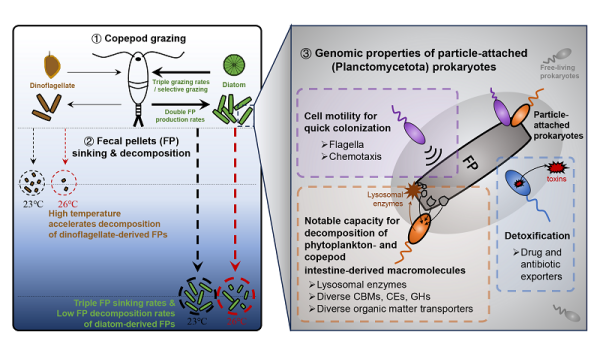 研究進(jìn)一步發(fā)現(xiàn),升溫會(huì)通過(guò)增強(qiáng)關(guān)鍵分解酶基因豐度加快FP分解,且對(duì)甲藻來(lái)源FP的加速效應(yīng)更為突出。全球變暖背景下,許多海域持續(xù)出現(xiàn)硅藻比例下降、甲藻比例上升的結(jié)構(gòu)性轉(zhuǎn)變,這意味著這些區(qū)域的POC會(huì)更快被再礦化并滯留在上層海洋。研究強(qiáng)調(diào),在評(píng)估碳匯功能變化時(shí),需將浮游植物組成、浮游動(dòng)物攝食與微生物動(dòng)力學(xué)過(guò)程作為一個(gè)耦合系統(tǒng)綜合考慮,才能更準(zhǔn)確刻畫(huà)BCP的響應(yīng)與不確定性來(lái)源。
