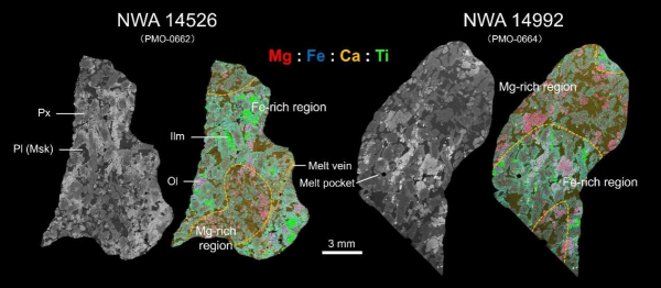 研究團隊利用掃描電鏡、電子探針、激光剝蝕電感耦合等離子體質譜和高分辨二次離子質譜等分析技術,對兩塊發現于2021年的月球隕石NWA 14526和NWA 14992,開展了詳細的巖相學、礦物學、地球化學和同位素年代學研究。研究結果表明,NWA 14526和NWA 14992在巖相結構、礦物成分、地球化學特征和結晶年齡上高度一致,具有成對關系,且兩者均呈現出獨特的巖性二分性:富鎂區的礦物成分較原始;富鐵區的礦物成分更偏演化,且富集晚期結晶類型。
