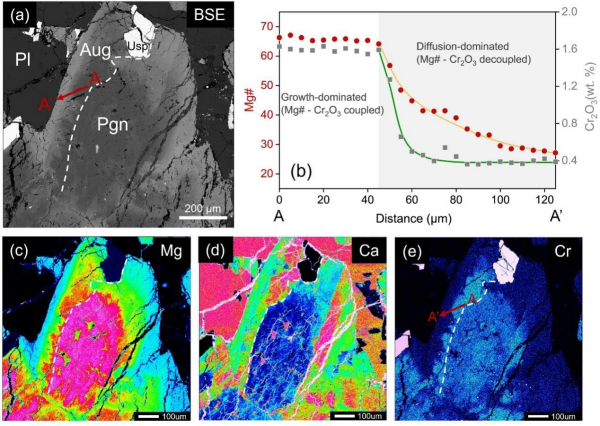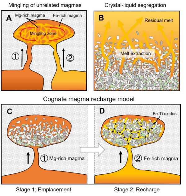 綜合輝石中熔蝕結構、鉻元素階梯式分布等開放系統證據,研究團隊認為,這種罕見的巖性二分性是由巖漿補給作用驅動產生的,并據此提出了同源巖漿補給模型:約30億年前,由月球內部早期侵入的富鎂巖漿在巖漿房部分結晶后,又有一股演化的相對富鐵巖漿“接力”注入,兩者混合、反應,最終形成了兩類巖性共存的結構。