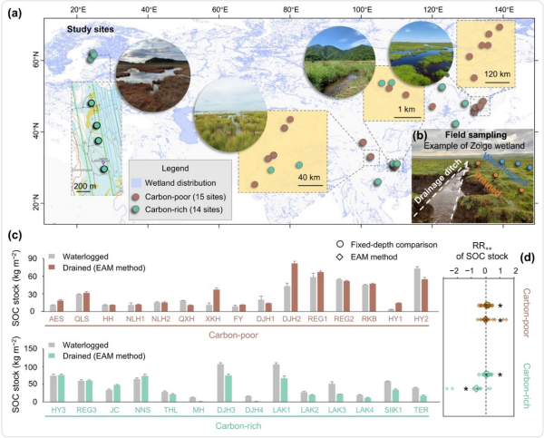 研究發現,長期排水導致富碳濕地泥炭蘚退化,加速有機碳降解,導致SOC儲量減少。相反,在貧碳濕地中,排水增加了植物輸入,增強了礦物保護作用,導致SOC儲量增加。團隊以SOC儲量的核心預測因子構建隨機森林模型,評估了過去一百年中國與芬蘭排水濕地0—50cm的SOC儲量變化。研究發現,在排除排水后耕種等人為擾動因素后,僅排水作用就使中國貧碳濕地SOC累計增加約1.80Gt,而芬蘭富碳濕地排水后SOC凈損失約0.32Gt。該研究首次在跨洲際尺度上揭示了富碳和貧碳濕地SOC儲量對長期排水的響應差異,并強調了全球變化背景下貧碳濕地被低估的碳匯潛力。