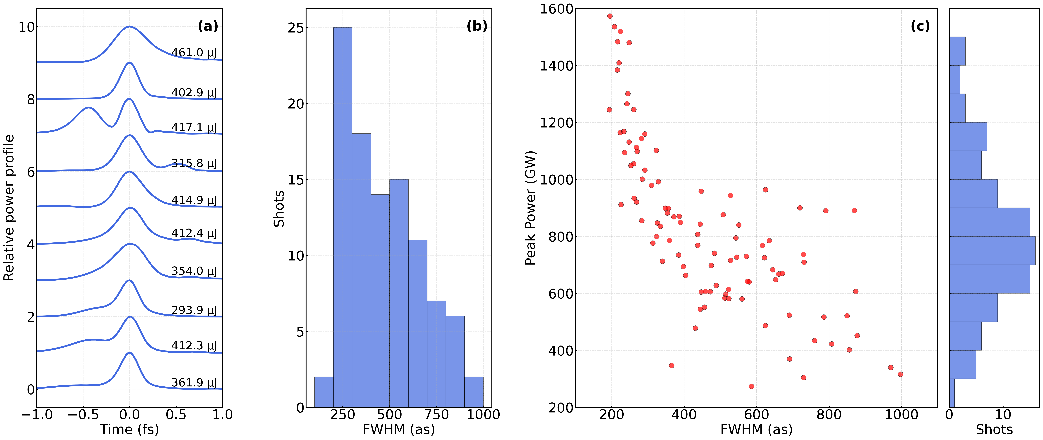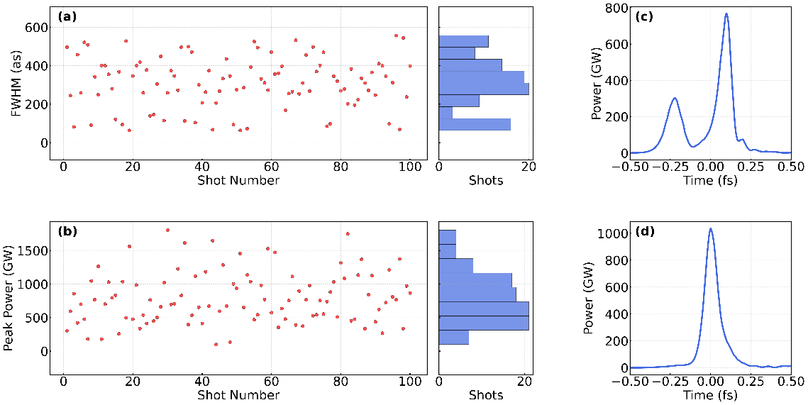 數值模擬結果表明,在考慮超導模組射頻相位抖動等實際運行條件的情況下,SHINE在硬X射線波段(6keV)可產生平均脈寬約300阿秒、峰值功率約0.8太瓦的X射線脈沖;在1keV軟X射線波段,可實現平均脈寬約470阿秒、峰值功率達太瓦量級的輸出。
