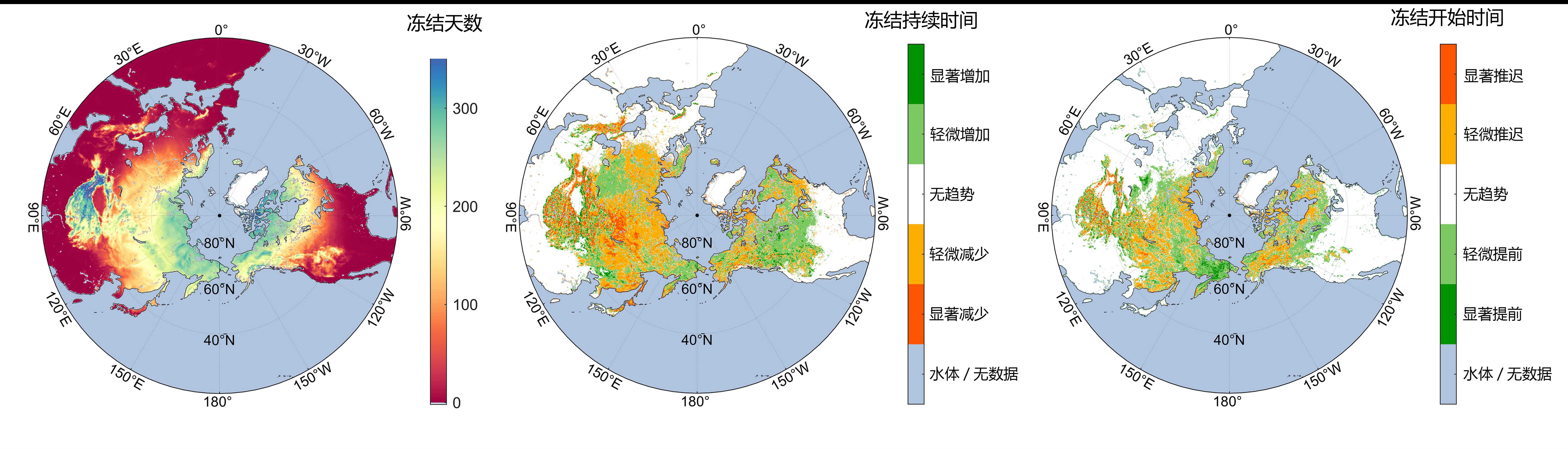 土壤凍融循環還如同調控農業與生態物候的“隱形開關”,其變化直接影響著春季植被返青、農作物播種等關鍵物候節點。基于該數據集的分析發現,21世紀以來,北緯45度以北地區,約14.35%的區域土壤凍結持續時間明顯縮短,約9.1%的區域凍結開始日期明顯推遲。這一變化或改變作物的適宜播種期,影響自然植被的返青時序,并重新分配生長季內的水分與養分。這些精細觀測數據,為預測農業氣候適宜性、評估生態物候變化、指導農業生產提供了科學支撐。
