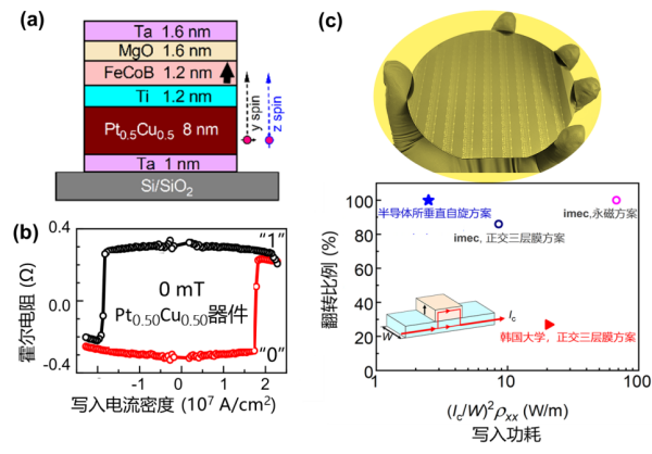 (a)垂直各向異性FeCoB器件結構;(b)零磁場下實現“0”和“1”狀態的100%全電翻轉;(c)晶圓級均一自旋軌道矩器件陣列及其功耗和翻轉比例。