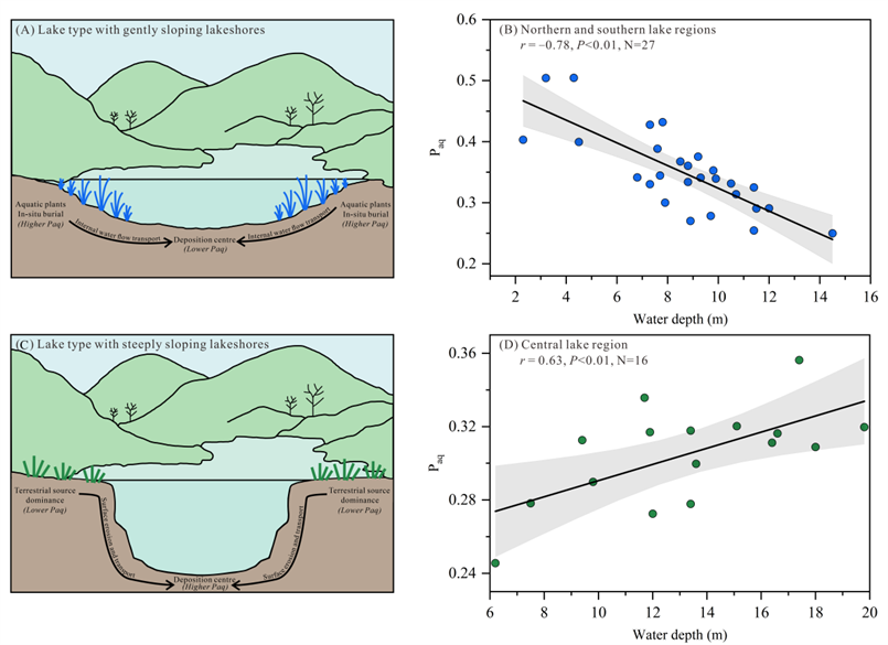 針對上述問題,中國科學院南京地理與湖泊研究所研究團隊提出了湖泊水下地形調控正構烷烴Paq指標與水位關系的假說。云南洱海水下地形具有北部、南部湖盆較平緩與中部湖盆較陡峭的地形特征,研究團隊將其選為研究對象,并通過系統調查該湖泊陸生植被與水生植被、湖泊沉積物中正構烷烴組成及空間分布特征發現,湖泊表層沉積物中長鏈與中鏈正構烷烴分別來自河流搬運輸入和水生植物原地埋藏,且全湖湖泊表層沉積物樣品的Paq指標與湖泊水位相關性較弱,這表明水下地形在變化情況下,Paq指標與水位的關系較為復雜。研究團隊進一步將研究區域劃分為北部、南部(緩坡型)及中部(陡坡型),發現Paq指標與湖泊水位的相關性顯著提升,但呈現兩種相反的相關性結果,上述結果證實了湖泊水下地形對正構烷烴指標在古水位解譯中具有調控作用的研究假說。