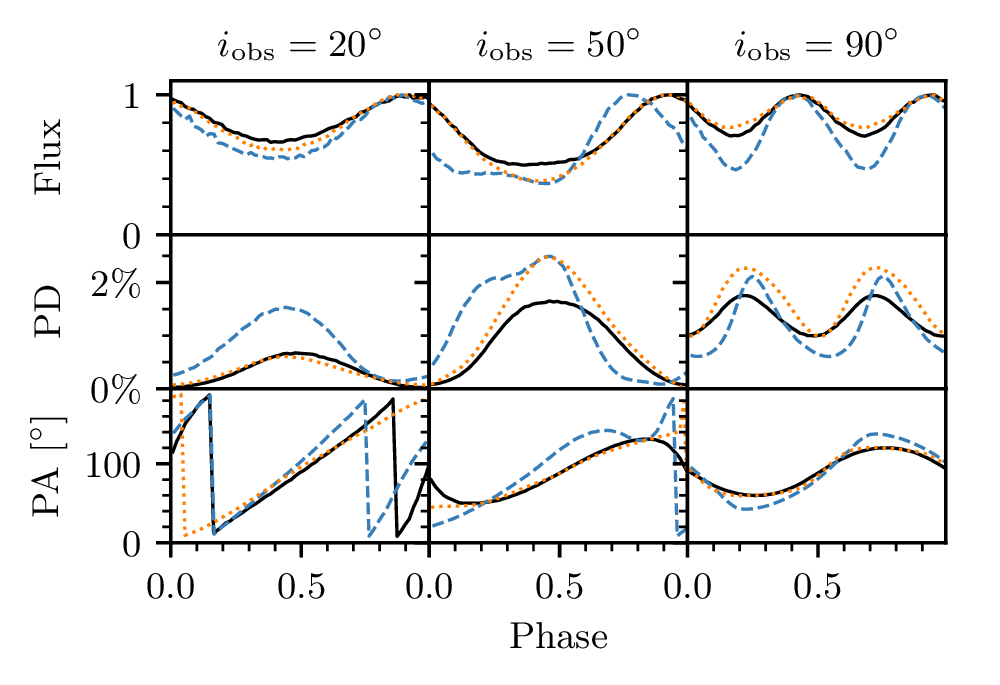 MONK-NS計(jì)算的不同幾何形狀熱斑脈沖輪廓(上)、偏振度(中)和偏振角(下)對比圖