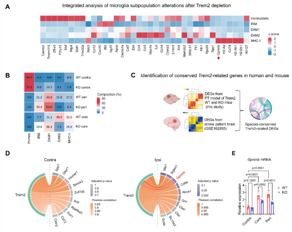 團隊通過整合小鼠卒中模型與卒中患者的轉錄組數據,鑒定出糖蛋白Gpnmb為Trem2下游具有物種保守性的關鍵調控靶點,并證實顱內注射可溶性Gpnmb重組蛋白可抵消Trem2敲除所帶來的神經保護效應。臨床樣本的分析顯示,卒中患者外周血中可溶性Trem2和Gpnmb的水平可有效預測疾病嚴重程度,展現出作為生物標志物的潛在應用價值。