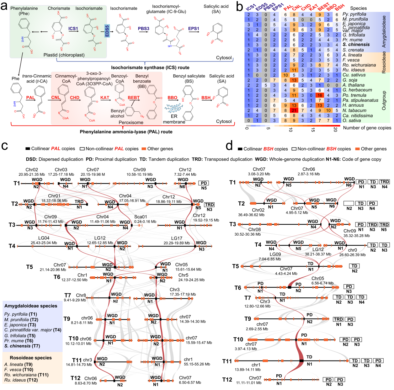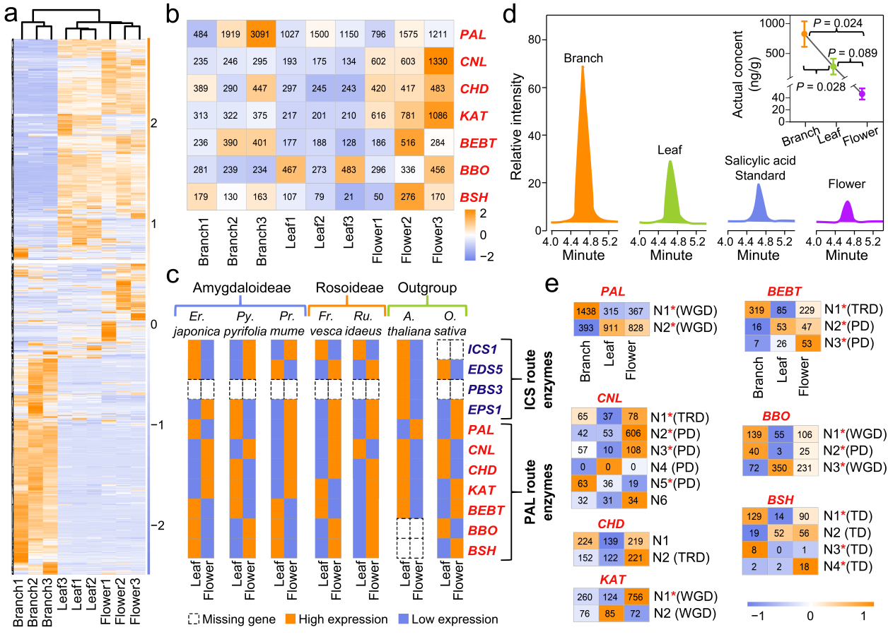 研究結果表明,PAL介導的途徑是薔薇科SA生物合成的主導路徑,并在進化上高度保守。在李亞科物種中,該通路主要通過WGD擴張;而在薔薇亞科中,則由WGD與小尺度復制(SSD)共同驅動。來源于WGD的基因普遍具有良好的共線性,并維持穩定高表達;而SSD來源的基因則表現出共線性降低和表達模式差異,反映出復制后的調控分化與亞功能化過程。