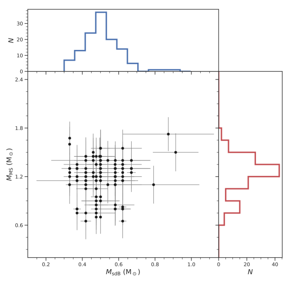 雙星系統中熱亞矮星與主序伴星的質量分布,熱亞矮星質量集中于0.5M⊙附近,而主序伴星質量范圍較寬。