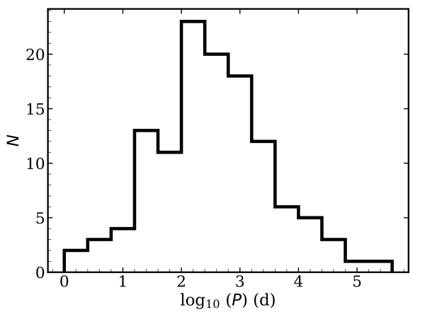通過蒙特卡洛方法統計推斷的軌道周期分布,系統周期主要集中在數十天至數千天的長周期區間。