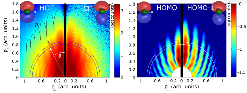 來自異核分子HCl不同分子軌道(HOMO與HOMO-1)的光電子全息圖案