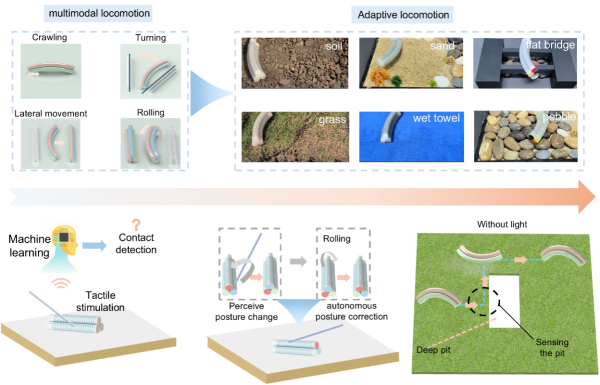 團隊進一步利用機器人感知—驅動一體化設計優勢,使機器人能夠基于自身感知信息進行環境感知與運動決策。機器人能夠在有光和黑暗環境下感知前方深坑,主動調整路徑繞行通過(障礙繞行);通過實時感知身體壓縮量,自動調節運動幅度穿越低矮隧道(窄道穿越);能夠實時感知自身姿態,在移動中發生側翻時自動調整恢復穩定運動(姿態自恢復);借助機器學習方法,可對不同類型的外界交互刺激進行識別與分類(外界刺激識別)。