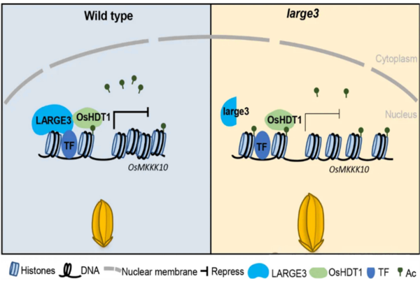進(jìn)一步研究發(fā)現(xiàn)LARGE3與組蛋白去乙酰化酶OsHDT1互作,通過影響水稻組蛋白H4乙酰化水平負(fù)調(diào)控籽粒長度。LARGE3與OsHDT1的復(fù)合體可結(jié)合OsMKKK10啟動(dòng)子區(qū)域,并通過降低該位點(diǎn)的組蛋白H4乙酰化水平,增加核小體密度,使染色質(zhì)處于緊密狀態(tài),從而抑制該基因表達(dá)。