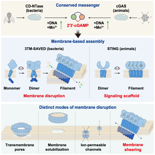 這項研究從信號分子、受體機(jī)制和效應(yīng)執(zhí)行三個層面,拓展了學(xué)界對天然免疫進(jìn)化多樣性的理解,揭示了2'3'-cGAMP在原核生物中的保守生成機(jī)制,闡明了其特異性驅(qū)動跨膜效應(yīng)蛋白變構(gòu)與高階裝配的過程,為理解天然免疫信號體系演化多樣性和膜蛋白破壞生物膜機(jī)制提供了新視角。