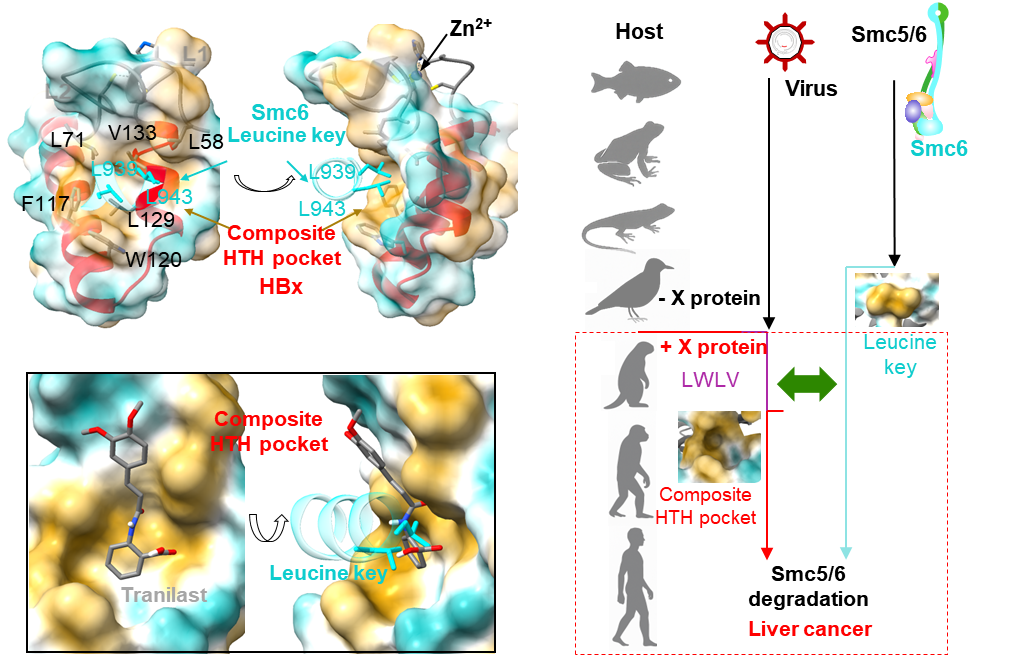 研究同時發現,Smc5/6復合物參與基因組穩定性維持及DNA損傷修復。哺乳動物感染嗜肝病毒后,其X蛋白介導的Smc5/6降解可導致基因組穩定性受損。此外,HBV慢性感染中,病毒基因組整合至宿主基因組的比例近乎100%。其表達的HBx截短突變體中,帶有組成型HTH口袋的突變體可維持對Smc5/6的降解能力。序列比對顯示,構成HBx組合型HTH疏水口袋的氨基酸殘基在所有HBV基因型乃至數千年前的古代HBV株中均一致。嗜肝病毒進化分析表明,X基因出現于哺乳動物肝炎病毒中,且該疏水口袋高度保守;從宿主角度看,Smc6的“亮氨酸鑰匙”在鳥類中已出現,并在哺乳動物中完全保守,提示二者存在共進化關系。這與僅在受感染哺乳動物中出現原發性肝細胞癌的表型一致,表明X介導的Smc5/6降解可能對肝細胞癌發生具有重要影響。因此,阻斷HBx-Smc6相互作用,有望成為抑制病毒復制并延緩肝炎向肝細胞癌轉化的潛在新靶點。