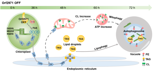 研究還發(fā)現(xiàn)Orf2971缺失后細胞內(nèi)的心磷脂含量明顯富集,富集的心磷脂會導致線粒體數(shù)量增加,形狀近似圓球,嵴結(jié)構(gòu)變得密集,心磷脂外移,呼吸作用加強,并可能發(fā)生線粒體自噬等。這說明增多的心磷脂會通過增強線粒體功能來補償葉綠體功能的下調(diào),進而維持細胞穩(wěn)態(tài)。這些研究結(jié)果為脂質(zhì)和自噬參與維持葉綠體蛋白穩(wěn)態(tài)調(diào)控途徑提供了新見解。
