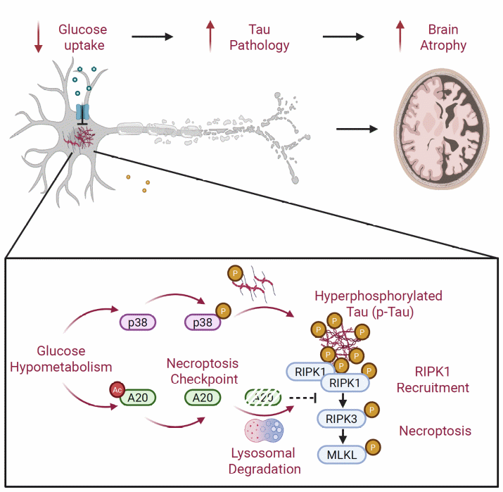 該研究揭示了一條由p-Tau–RIPK1軸介導(dǎo)的代謝驅(qū)動型程序性壞死機制,為理解大腦葡萄糖代謝與Tau病理之間的功能聯(lián)系提供了依據(jù),并為阿爾茨海默病的干預(yù)策略提供了新思路。