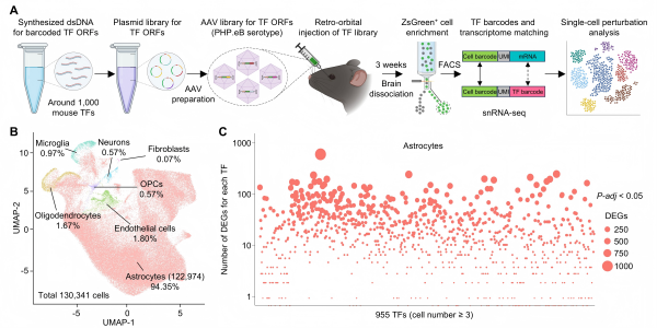 此后研究以攜帶星形膠質細胞特異性啟動子的腺相關病毒為載體,制作“智能快遞員”,把近1000個轉錄因子的“指令包”,分別精確地送到小鼠的星形膠質細胞中,讓每個細胞的狀態和它收到的“指令包”精準關聯。
