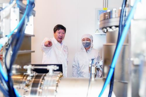 2025年9月,上海技物所國產自動化紅外材料外延設備投入運行時,陸衛(左)和同事在觀察設備狀態。上海技物所供圖