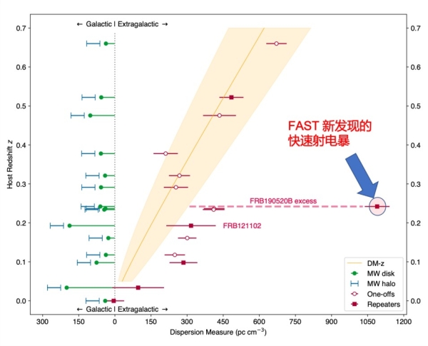 圖1. 從色散-紅移關系上清晰可見FRB 20190520B擁有最大的宿主星系電子密度。圖中斜線為包含了宇宙主要重子物質成分的“Macquart Relation”。