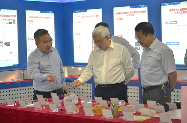 在福建物構所,侯建國一行首先參觀了研究所科技展廳,深入了解研究所發展歷史和近年來的重大創新成果,隨后調研了結構化學重點實驗室、極端增材制造實驗室和大尺寸LBO晶體研發中心,詢問相關科研項目進展、重要儀器設備研制、實驗平臺建設和成果轉化等情況,與一線科研人員深入交流,鼓勵大家瞄準科技制高點潛心攻關,為實現高水平科技自立自強再立新功。