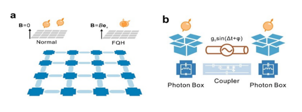 成果示意圖。16個非線性“光子盒”陣列囚禁的微波光子強相互作用形成分數(shù)量子反常霍爾態(tài)(注:“光子盒”的名字最早來自1930年愛因斯坦和波爾爭論提出的思想實驗)