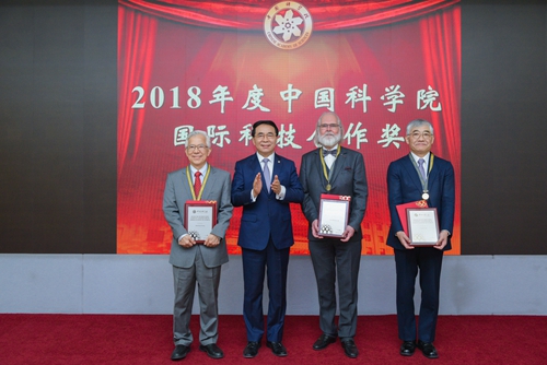 2018年度中國科學院國際科技合作獎結果于1月17日揭曉。來自新加坡國立大學施春風(Shih Choon Fong)教授、挪威奧斯陸大學尼爾斯·克里斯蒂安·斯坦塞斯(Nils Christian Stenseth)教授及日本東京大學小池俊雄(Toshio Koike)教授獲獎,同時對獲獎專家的合作單位中國科學院大學、中科院動物研究所和中科院青藏高原研究所給予了通報表彰。中科院副院長張亞平宣讀了獲獎名單和表彰決定,中科院院長白春禮為到場的三位外國獲獎專家頒發獎狀和獎牌。
