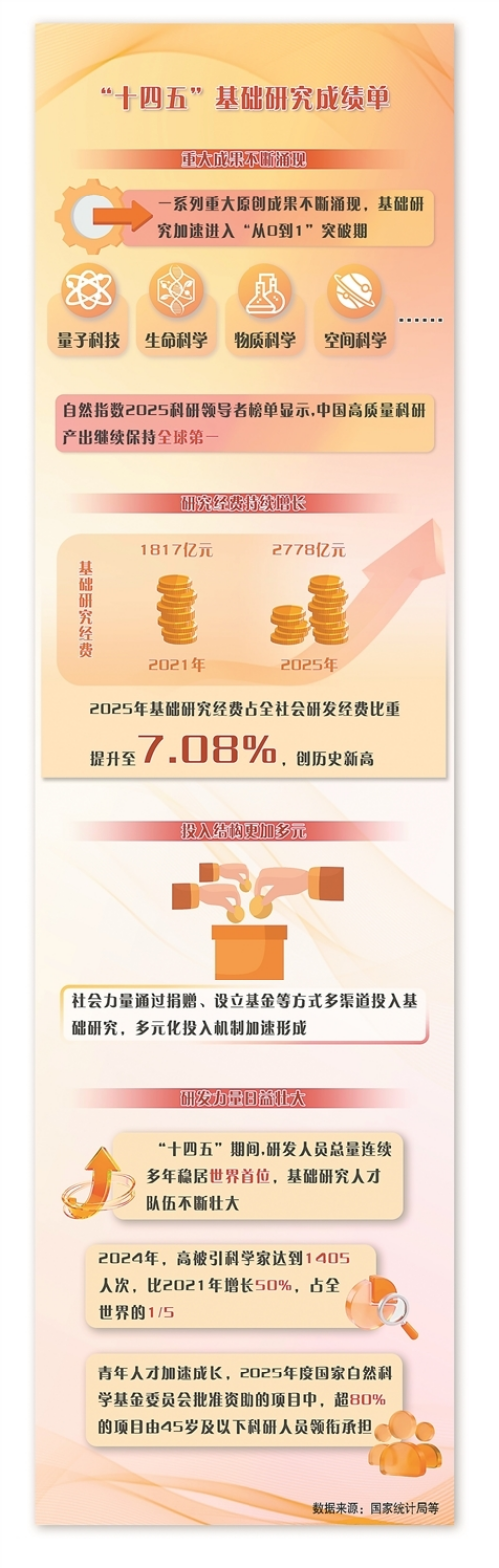 “十四五”以來,我國基礎研究投入持續加大,基礎研究體系不斷完善,基礎研究整體實力顯著增強。展望“十五五”,要從基礎研究頂層設計、投入機制、人才培養、評價改革等方面多管齊下,為原始創新松綁,為高質量發展蓄能。