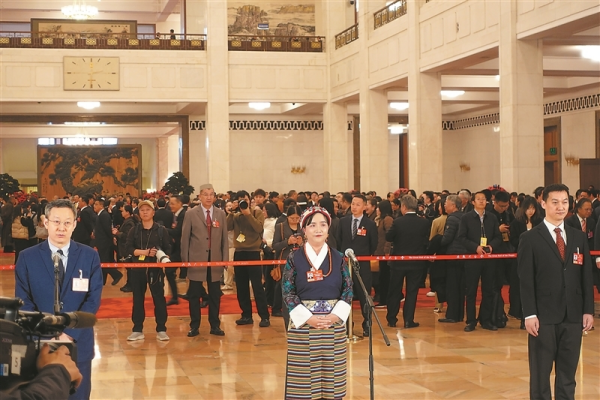 三月七日,全國政協十四屆四次會議第二場“委員通道”集體采訪活動在北京人民大會堂舉行。從左到右依次為徐星、明吉措姆、劉爭。本報記者 王姍姍攝