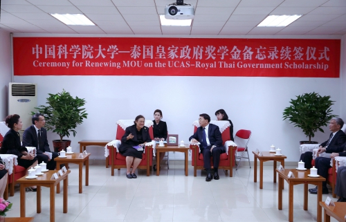 白春禮介紹了他于2013年擔任發展中國家科學院(TWAS)院長以來為推動南南科技合作而設立“中科院-發展中國家科學院院長獎學金”(CAS-TWAS President's Fellowship)計劃的情況。他說,目前已有40多名泰國留學生獲得該獎學金資助在國科大學習。此外,還有數位泰籍博士后和訪問學者獲中科院國際人才計劃支持在華進修或訪問。為了讓更多的泰國學生和學者了解國科大和中科院,白春禮建議國科大和泰方合作,實施國際夏令營項目。