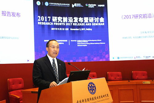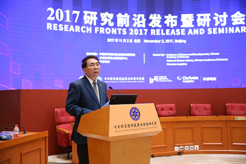 11月2日上午,由中國科學院科技戰略咨詢研究院、文獻情報中心與科睿唯安公司聯合舉辦的2017研究前沿發布暨研討會在北京舉行,會上向全球發布《2017研究前沿》報告和《2017研究前沿熱度指數》報告。中科院院長、黨組書記白春禮出席并致辭,中科院副院長張濤出席并主持會議,科睿唯安公司全球首席商務官Robert Lemmond出席會議。科學技術部、中國工程院、中國科學技術協會、國家自然科學基金委員會、軍事醫學科學院、清華大學,以及新華社、中央編譯局、中國宏觀經濟研究院等部分首批國家高端智庫試點單位等全國100余家政府部門、科研院所、大學和企事業單位的350多位科學家、科研管理人員和情報研究人員參加會議。
