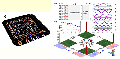 在超導體系方面,2015年,谷歌、NASA和UCSB宣布實現了9個超導量子比特的高精度操縱,這一記錄在2017年被中國科學家團隊首次打破。朱曉波、王浩華和陸朝陽、潘建偉等合作,自主研發了10比特超導量子線路樣品,通過高精度脈沖控制和全局糾纏操作,成功實現了目前世界上最大數目的超導量子比特的多體純糾纏,并通過層析測量方法完整地刻畫了十比特量子態。研究團隊進一步利用超導量子線路演示了求解線性方程組的量子算法,證明了通過量子計算的并行性加速求解線性方程組的可行性,相關成果即將發表于《物理評論快報》。研究團隊目前正致力于20個超導量子比特樣品的設計、制備和測試,并計劃于今年年底前發布量子云計算平臺。