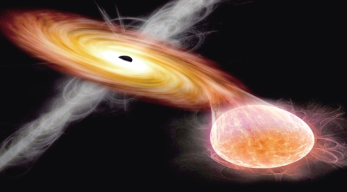 由一顆普通恒星和一個黑洞或中子星組成的雙星系統吸積過程示意圖。