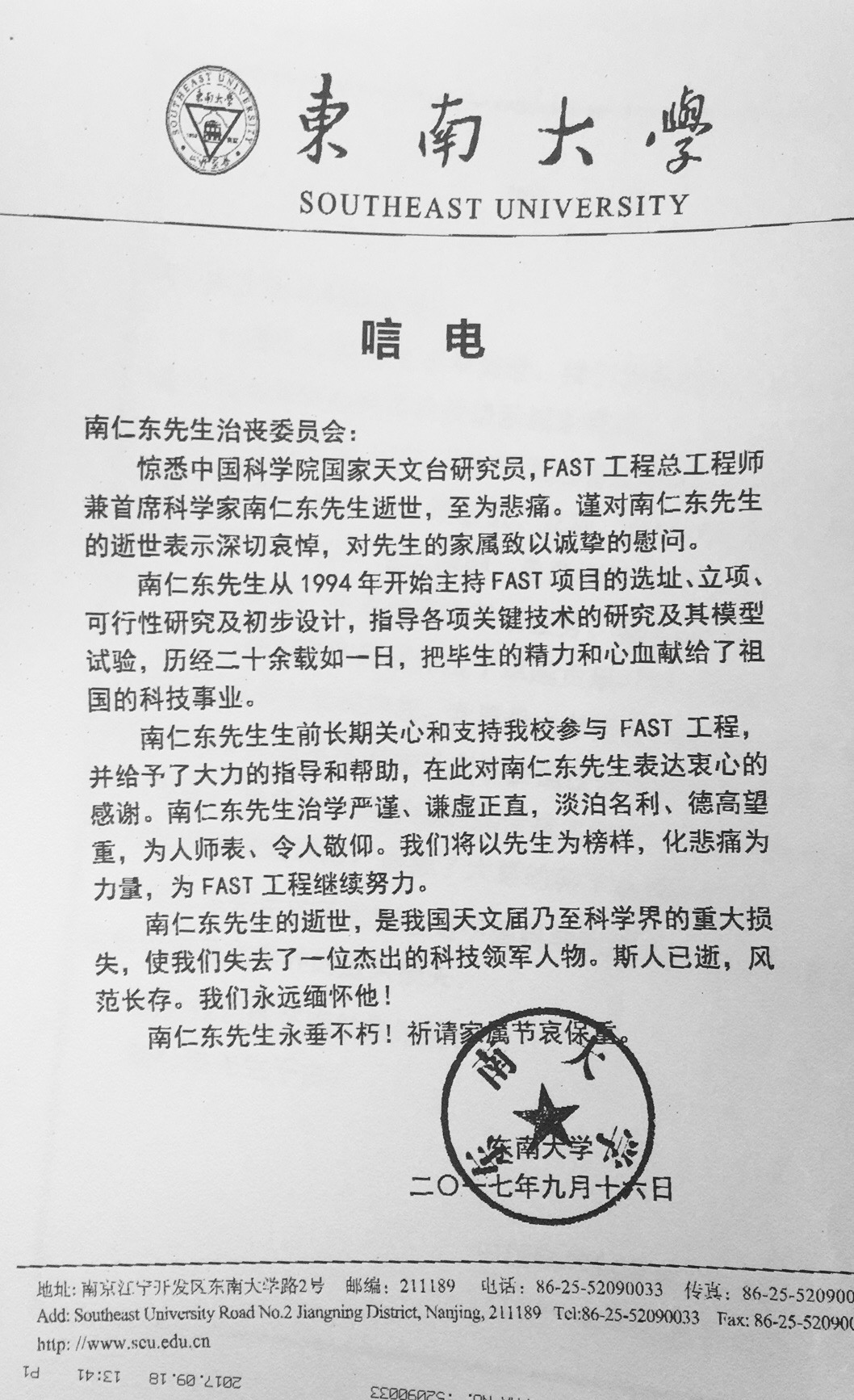 東南大學唁電