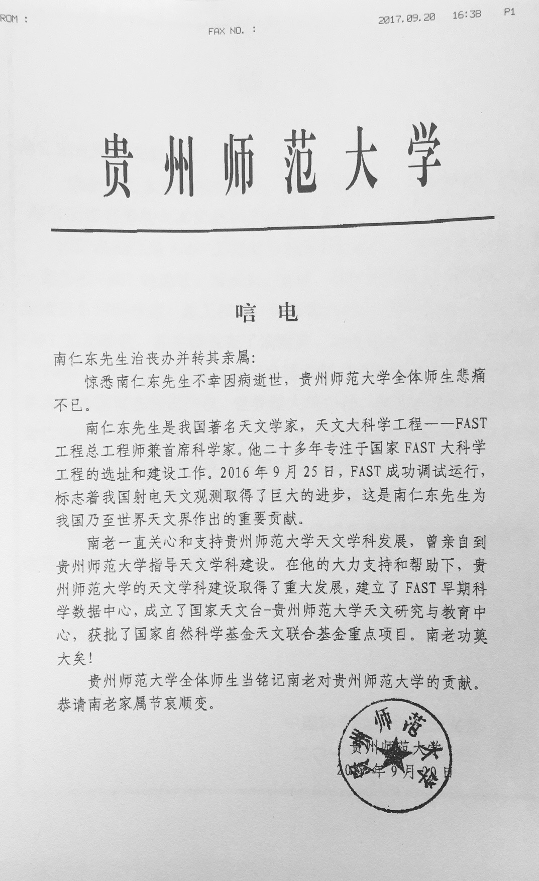 貴州師范大學唁電